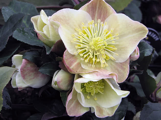 Yhdistää puutarhahybridi-lajikkeet erityyppisten helleboren ja eriväristen kukkien välillä, joiden halkaisija on 5-8 cm, esimerkiksi: