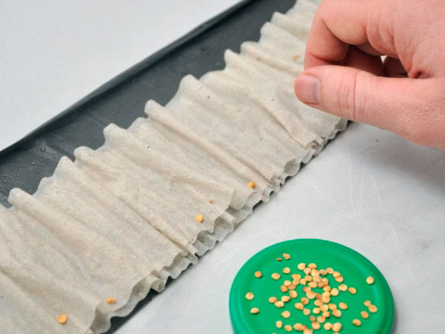 - vienmērīgi izklājiet sēklas pa visu papīra virsmu un nedaudz iespiediet tās tajā;