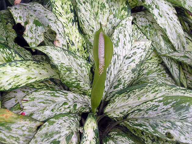 Vista com folhas verdes monocromáticas de forma cordada ou pontiaguda com uma nervura central clara distinta. O comprimento das folhas é de 30-35 cm. O híbrido mais famoso desta espécie é o Green Magic, um pequeno arbusto denso com folhas de uma cor invulgar: são verde-azulado escuro com uma nervura central branca. Existe uma forma com pequenas manchas claras ao longo da lâmina da folha.
