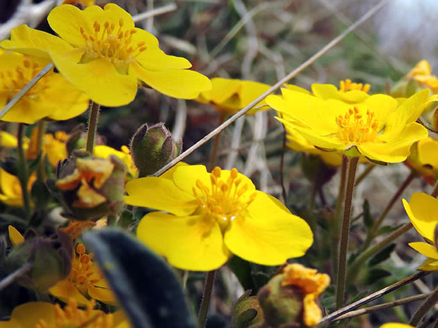 - Rainha Amarela - Potentilla de até 30 cm de altura com flores amarelas brilhantes;